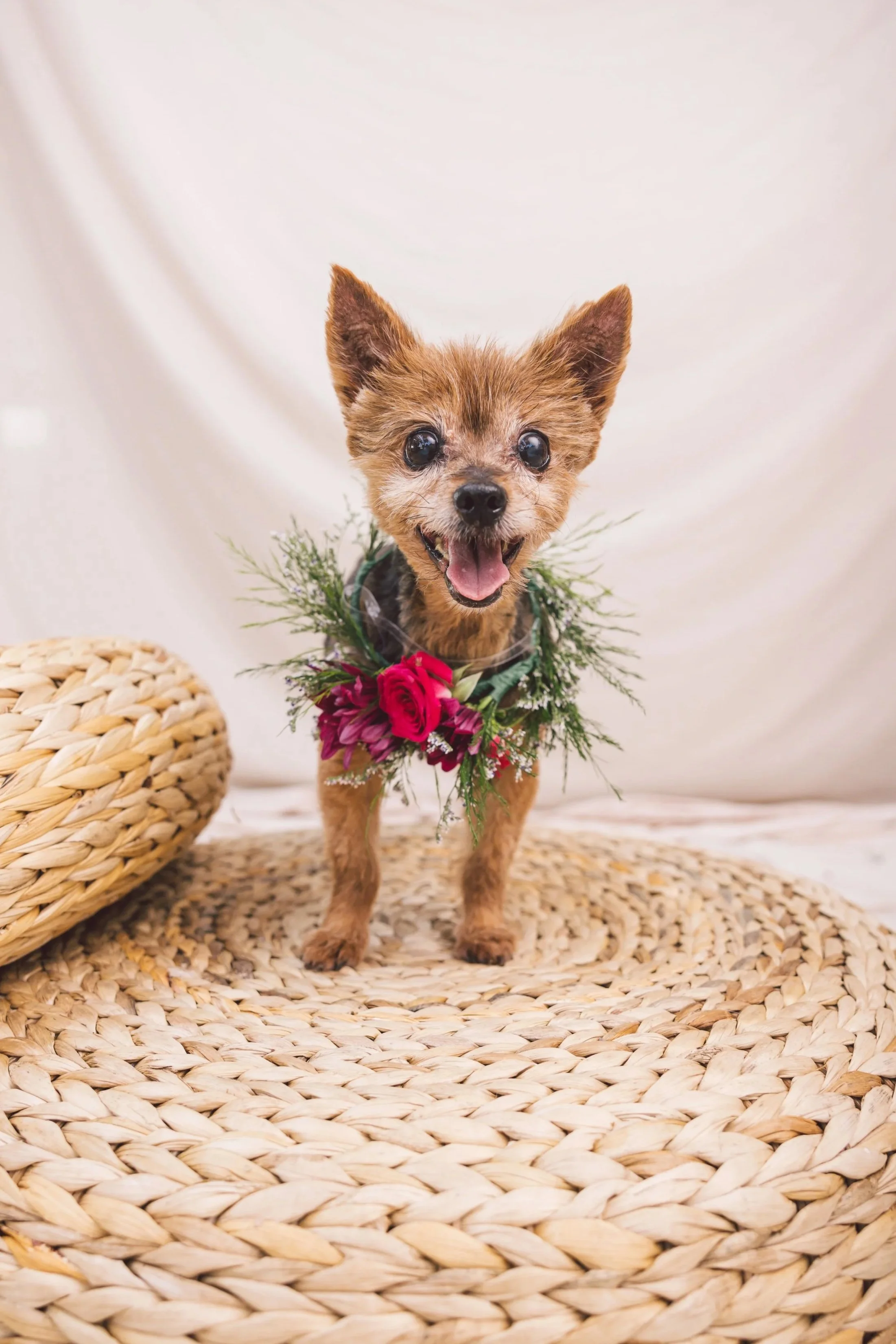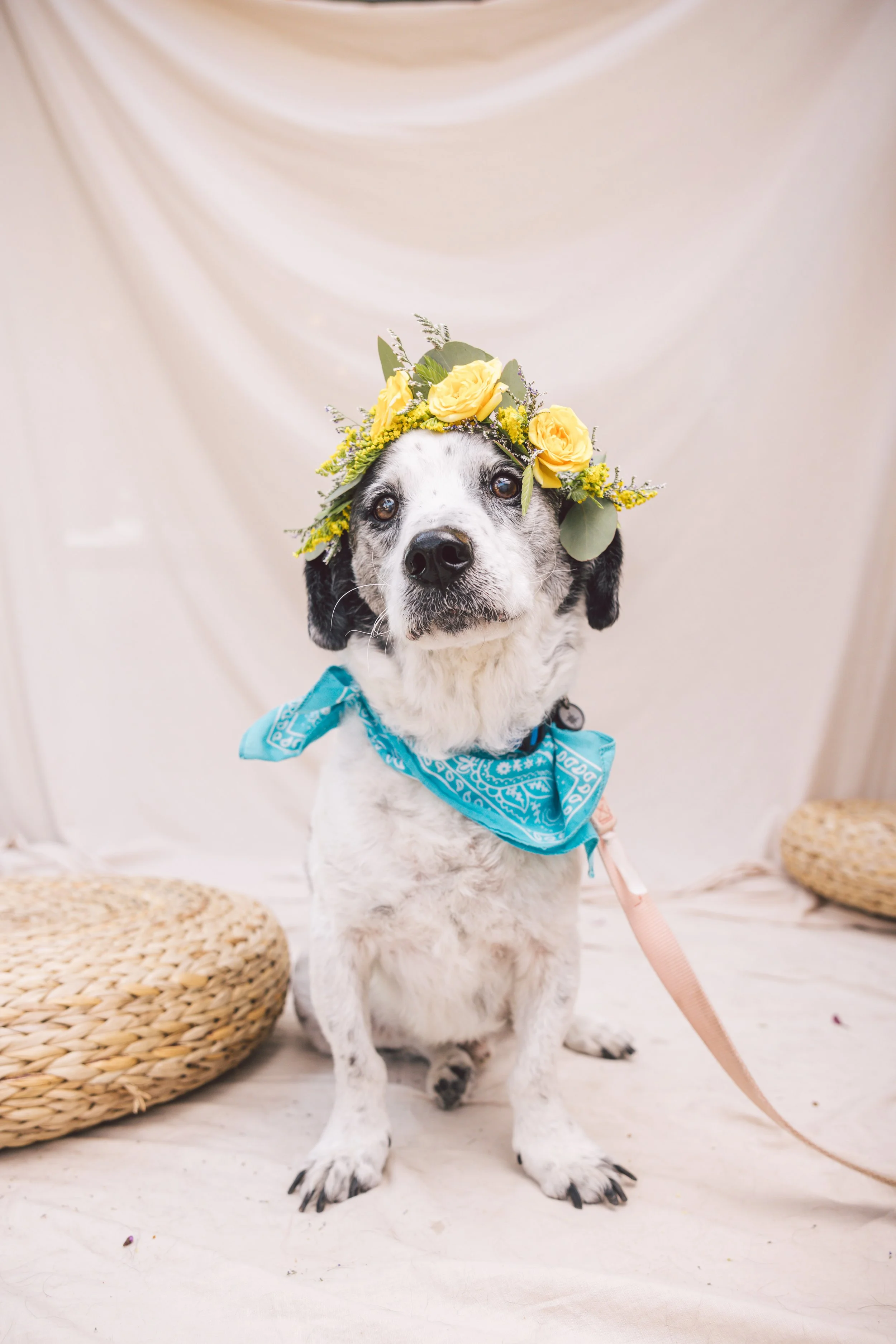 Join us at the Carpenter Hotel for a delightful morning of senior pup pampering! Ben White Florist has prepared 10 beautiful flower crowns for your senior to pose in. These crowns come in different sizes and flower assortments, so you can pick the perfect crown.